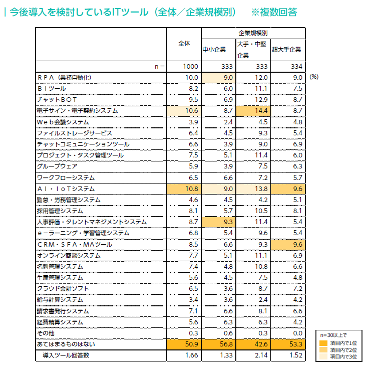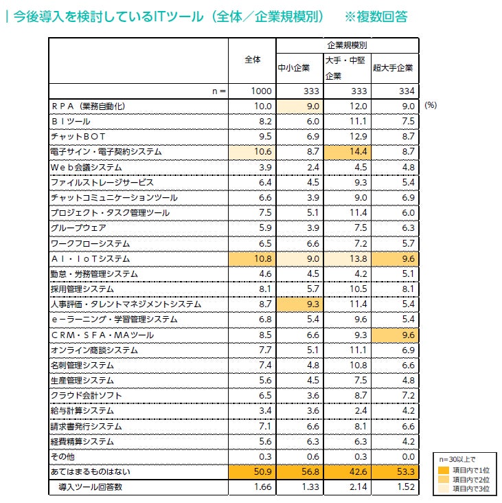 企業規模別に見ると、すべての規模で「AI・IoTシステム」が上位にあがったが、中小企業では「人事評価・タレントマネジメントシステム」、大手・中堅企業では「電子サイン・電子契約システム」、超大手企業では「CRM・SFA・MAツール」が上位にあがるなど差がみられた。