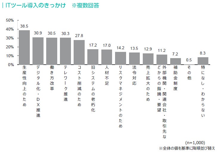 ITツール導入されたきっかけとしては、「生産性向上のため」が38.5%でトップ、次いで「デジタル化・DX推進」が30.9%、「働き方改革」が30.5%という順であった。