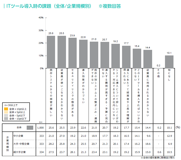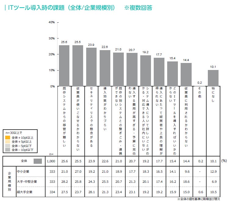 ITツール導入時の課題としては、「既存システムからの移管が難しい」がトップで25.6%、次いで「従業員が使いこなせるかわからない」「セキュリティリスクの懸念がある」が上位であった。