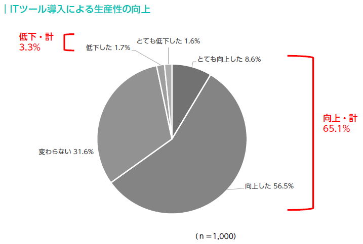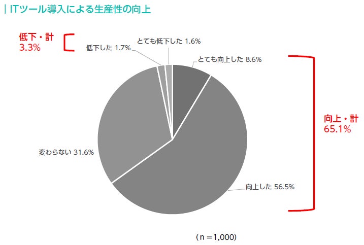ITツール導入による生産性への影響については、「とても向上した」「向上した」の合計が65.1%と多くの人が生産性の向上を実感していることがわかった。