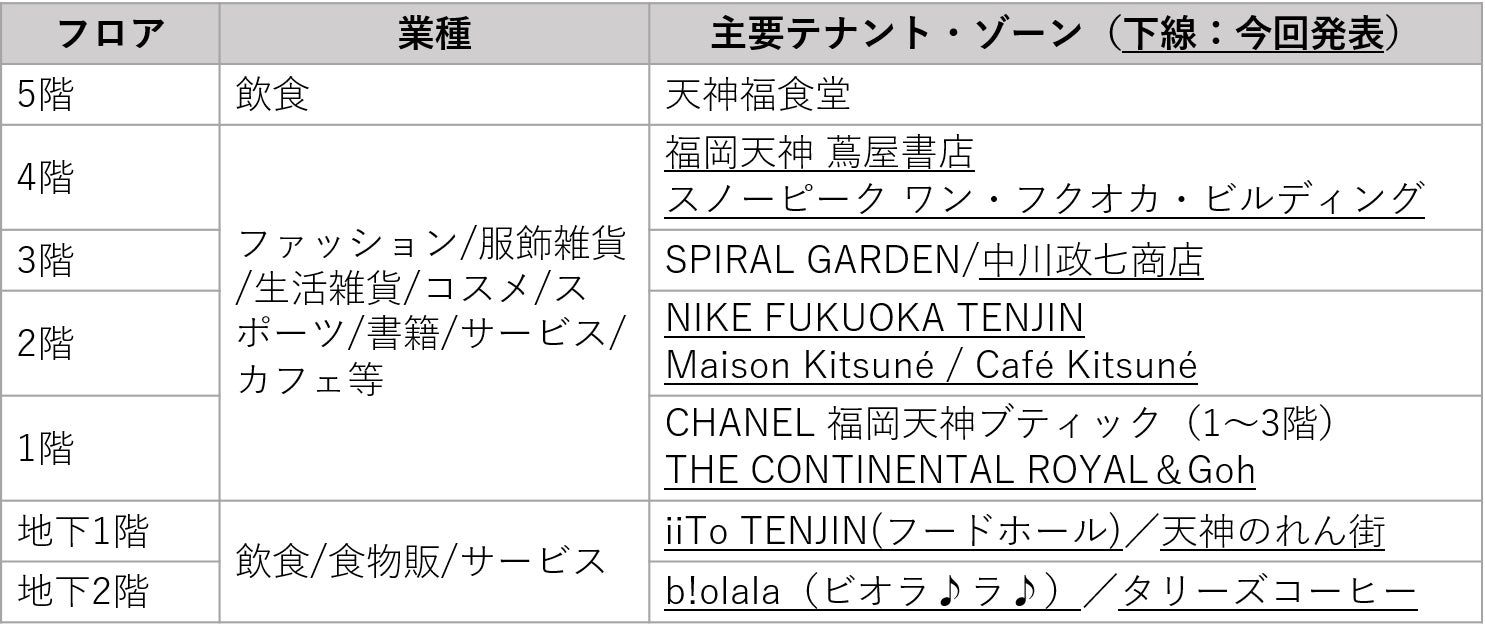 西日本鉄道株式会社(福岡市博多区、代表取締役社長執行役員 林田浩一)が「天神ビッグバン」エリア内で開発中の大型複合ビル 『ONE FUKUOKA BLDG.(以下、ワンビル)』。地下2階~地上5階の商業フロアには、ローカルの名店から世界の超一流ブランドまで、バリエーションに富んだ約120店舗が出店予定です。開業を約半年後に控えた今回、主要テナント・ゾーンの一部を先行発表します。
