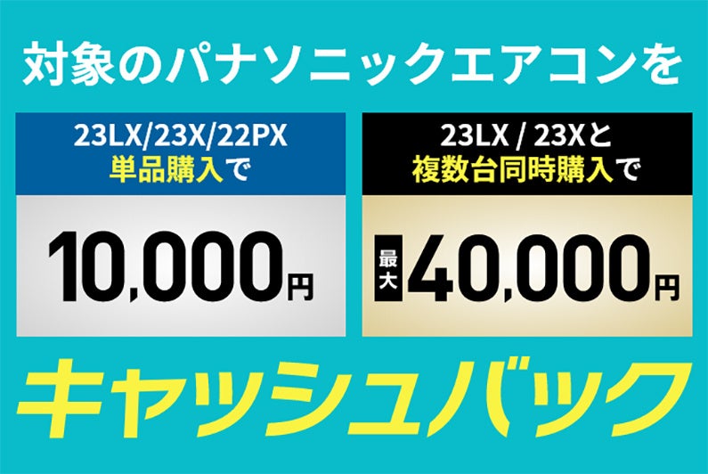 期間中に2023年モデルLX、Xシリーズ(住宅設備用エアコン品番は対象外)とあわせて、対象商品を複数台同時購入の上、ご応募いただいた方全員に、最大40,000円をキャッシュバック。