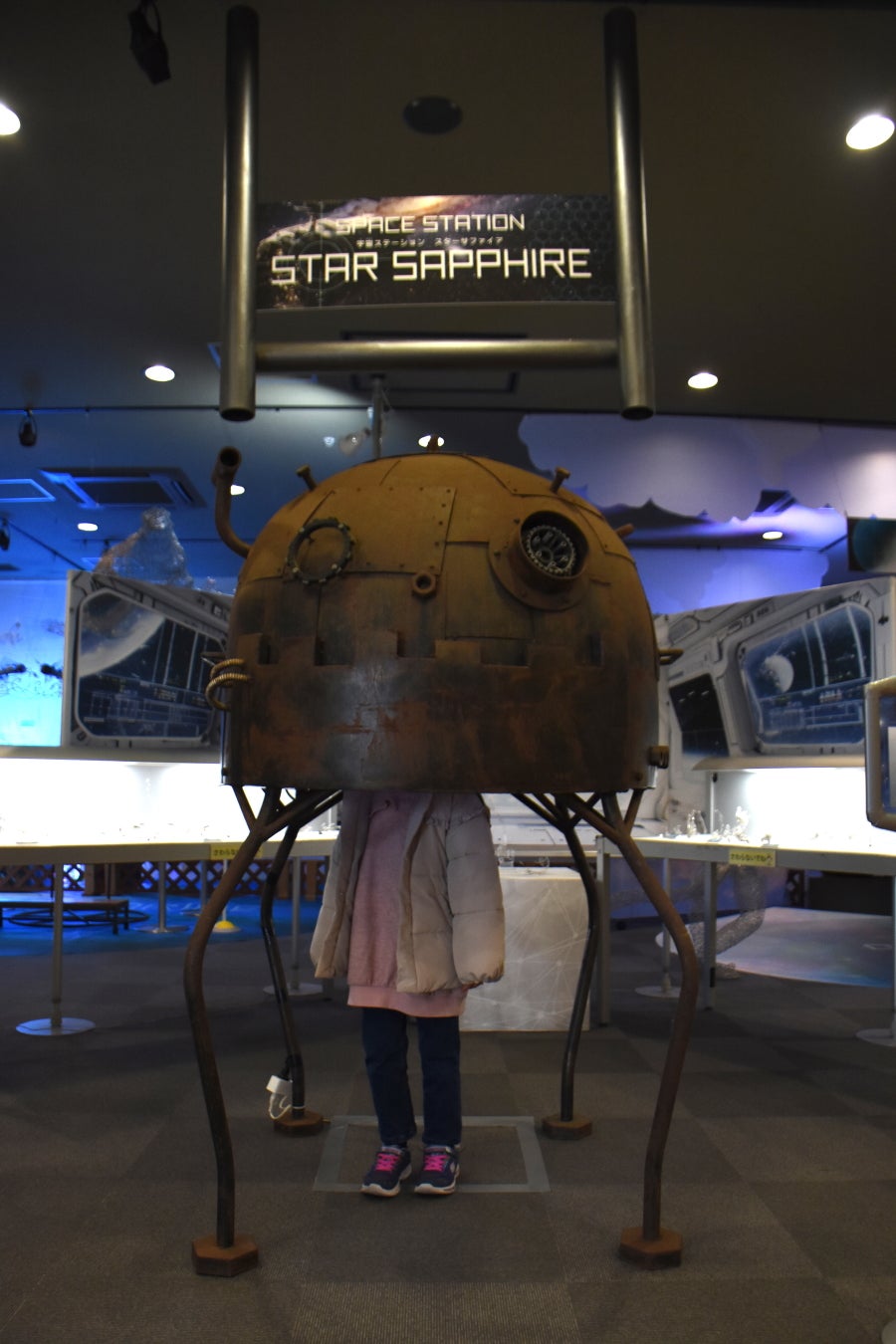中央の宇宙ステーションに配置されているのは、宇宙人になりきれる金属製の顔はめパネルや中に入ってまるで宇宙空間のような万華鏡の世界が体感できるマノミホさんの作品。また、橋さんによる小さなカエルたちは、騒がしく話す言葉も針金で描かれており、日々の暮らしぶりも垣間見ることができます。