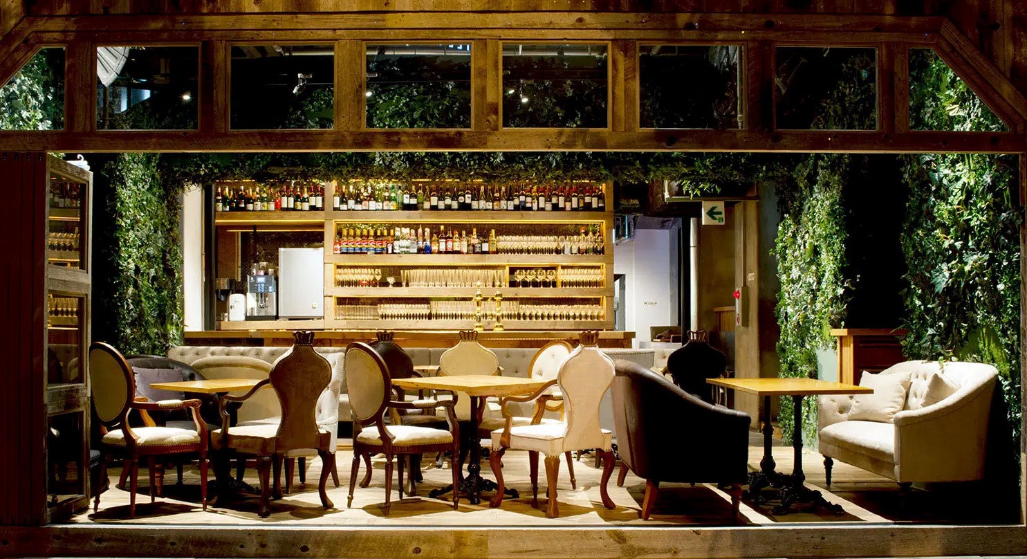 全天候型のインナーテラスとグリーンに包まれた店内で