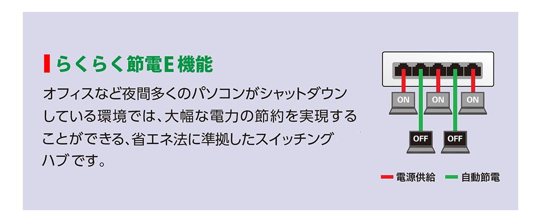 省エネ法に準拠の省電力機能で、自動的に省エネ貢献できるらくらく節電E機能対応。IEEE 802.3az(EEE規格)に対応しているスイッチや端末との組み合わせで手間なく自動的に省エネを実現します。