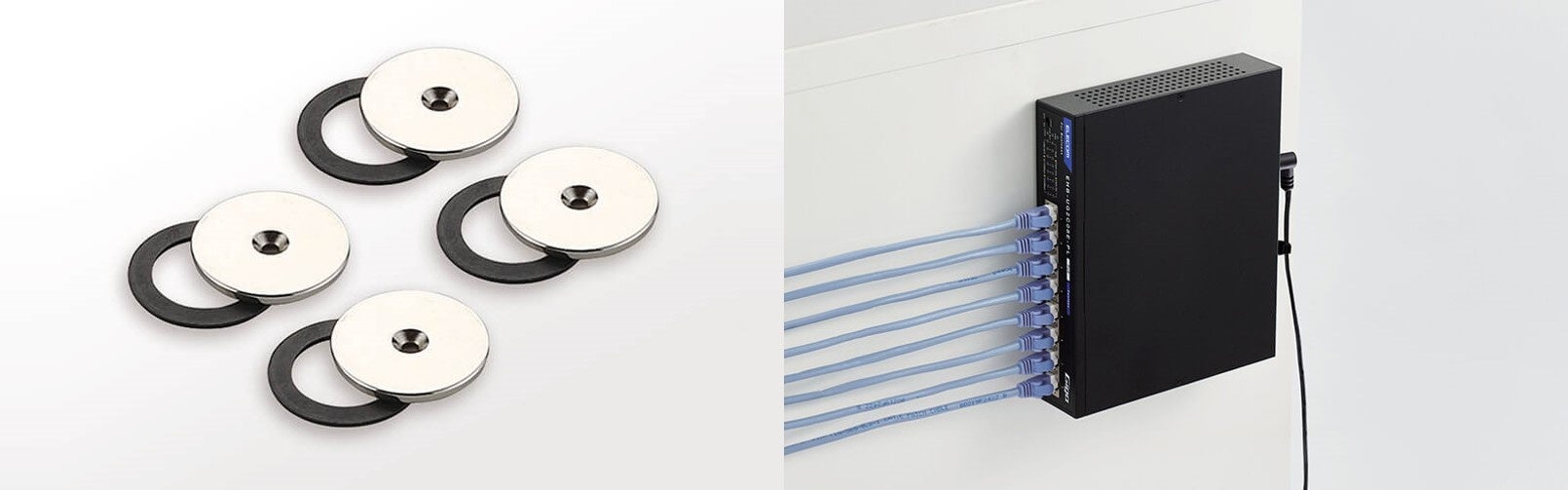 付属の金具を使った19インチラックマウントに対応するほか、底面の取付穴を使った壁面設置も可能です。さらに5/8ポートモデルは別売のマグネットを使って金属面への取り付けることもできます。