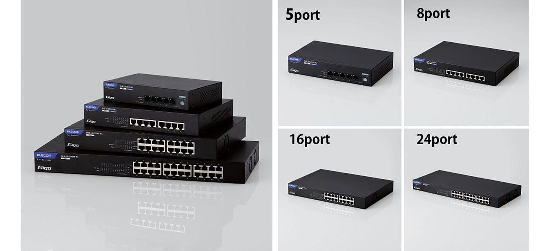 業務用ネットワーク向けにおすすめの1Gbps(1000BASE-T)対応、アンマネージ仕様の5/8/16/24ポートのギガスイッチングハブです。法人ニーズに幅広く対応する多彩な機能を搭載した高信頼・長寿命モデルです。