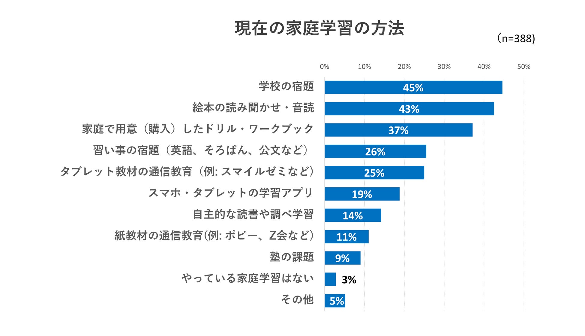 最も多かったのは「学校の宿題(45%)」でした。学校から出される宿題が、家庭学習の中心になっている家庭が多いことがわかります。