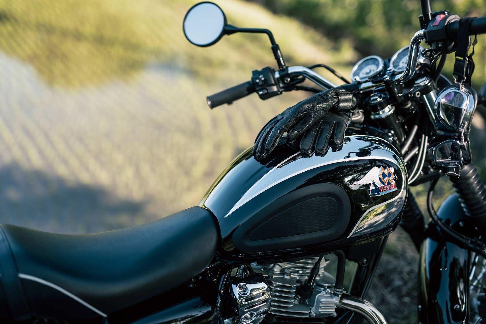 ・エボニーとクロームメッキで仕上げられたティアドロップ型フューエルタンクと、MEGUROの誇りを示す立体エンブレム