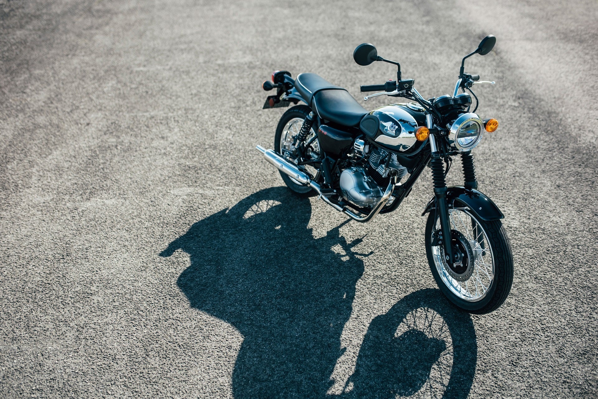 黒を基調に、効果的に配されたクロームメッキが輝くカラーリング。フューエルタンクには手作業で色付けされた「メグロ」のエンブレムがその存在を際立たせます。大型の冷却フィンを持つエンジンは、空冷4ストローク単気筒。エンジンカバー類はクラシカルな形状を持ち、かつての鉄部品を思わせる耐熱黒塗装が施されたシリンダーなど、各部にこだわりのデザインが施されています。