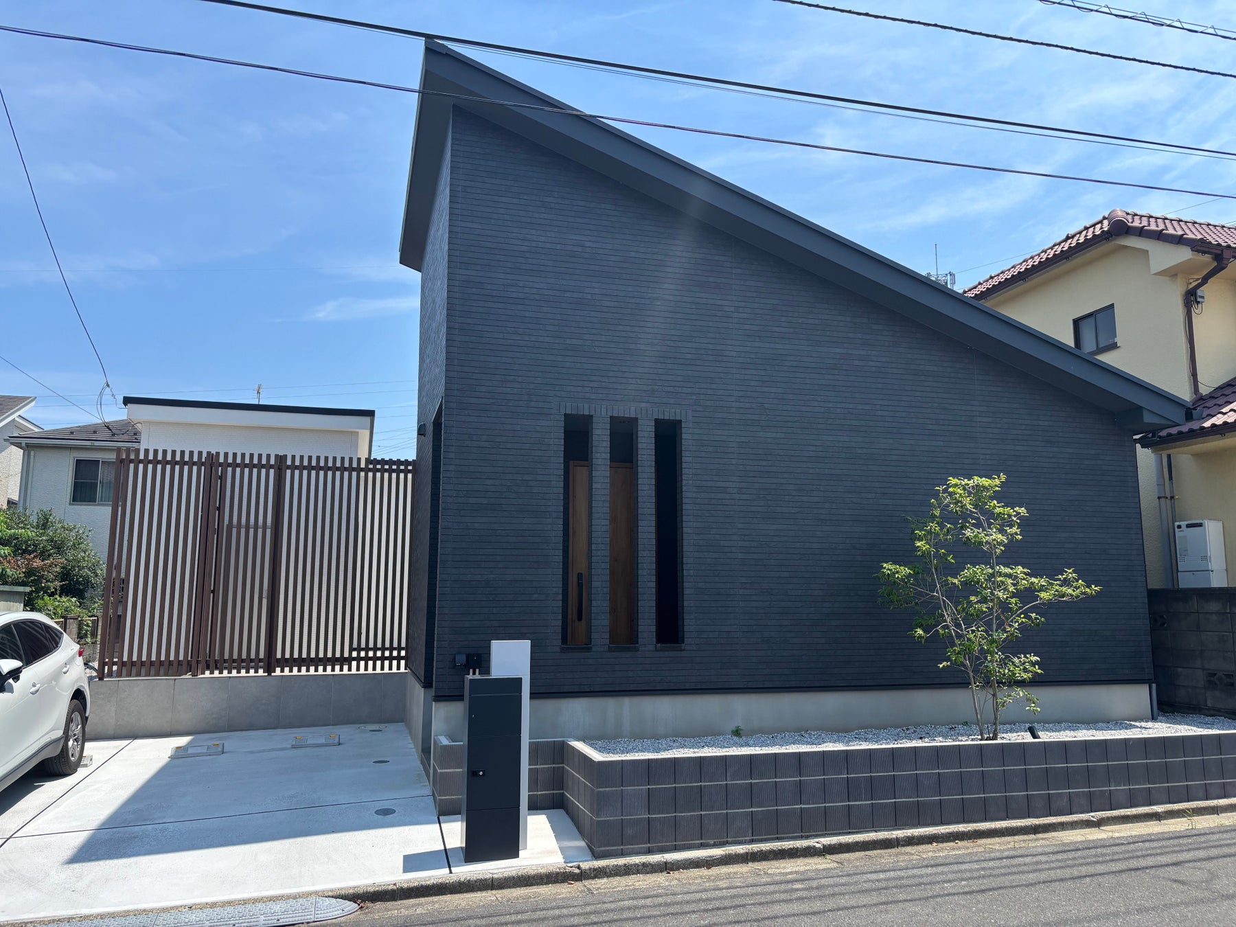外観は、道路側にあえて窓を設けず、ファサード全体を外壁で構成。大面積でありながら単調な印象にならないよう、砂岩調の質感を持つ「シャルムロック」を採用し、光沢を抑えた深みのある黒で、重厚感と上質さを演出しています。