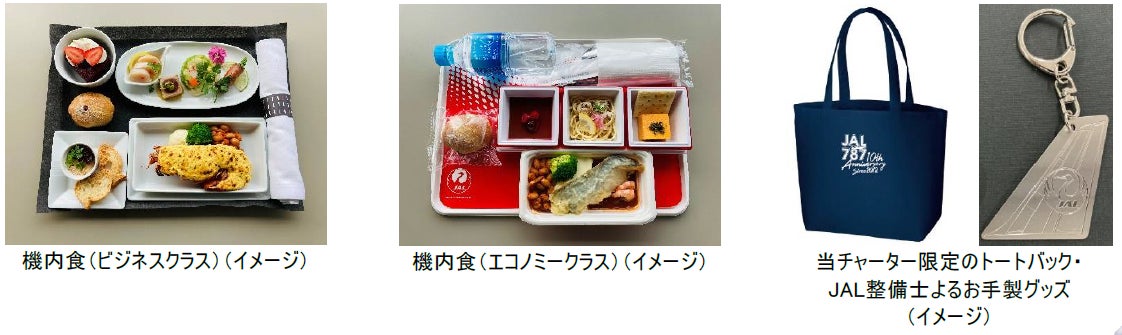 10周年企画の一つとして、グループ会社のジャルパックと共に、ボーイング787の魅力をご堪能いただける周遊チャーターを企画しました。機内では、ボーイング787の初便に乗務した運航乗務員と客室乗務員によるトークイベントを実施するほか、ボーイング社のスタッフが自ら語るボーイング787の魅力解説、JAL仕様のボーイング787が完成するまでの動画をご覧いただけます。機内食では、ビジネスクラスは就航当時のメニューであるオマール海老のテルミドールを再現し、エコノミークラスはボストンをイメージした白身魚のフリッターアメリカンビスクソースを含むお食事のご提供を予定しています。当チャーター限定のトートバックやJAL整備士よるお手製グッズなどのお土産もご用意します。