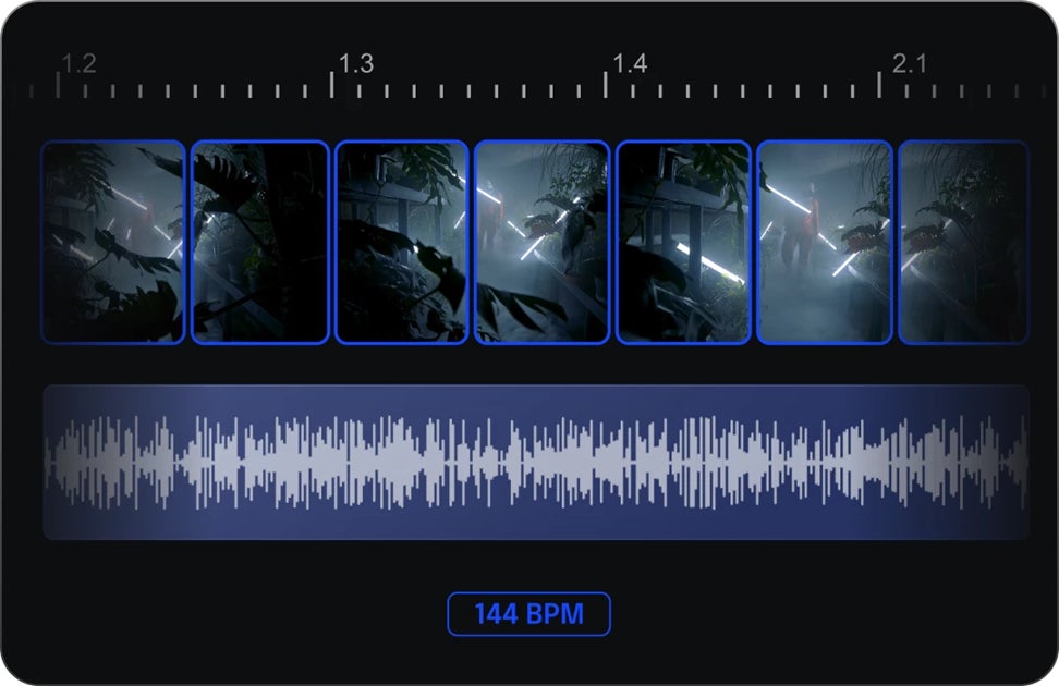 ビートに合わせて正確に編集できます。音楽の重要な箇所を検出してマークすると、それに合わせてビデオを簡単に編集できます。