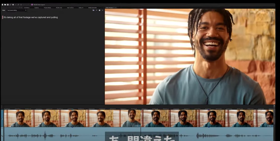 テキストドキュメントのようにビデオを編集できます。映像内の音声をAIでテキスト化。そのテキストを編集して移動、切り取り、コピー、貼り付けなどを実行すると、VEGAS Proはその内容を即座に動画にも反映します。
