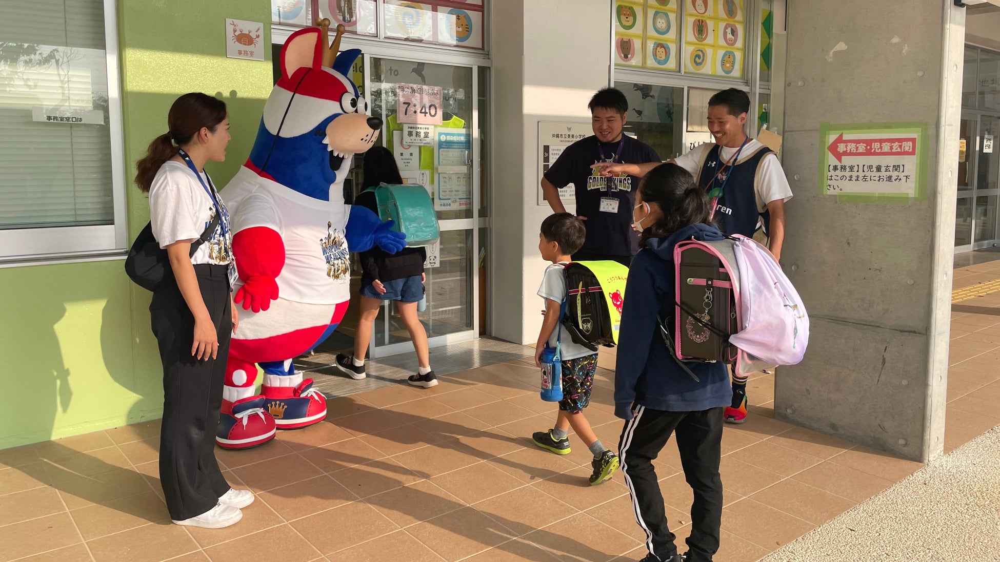 新学期が始まり、登校する子どもたちは不安と期待が溢れる表情でしたが、ゴーディーを見つけると、「また来てくれてありがとう」、「試合頑張ってね」等と声をかけてくれました。また、朝から元気いっぱいな子どもたちとハイタッチやじゃんけんをして交流しました。