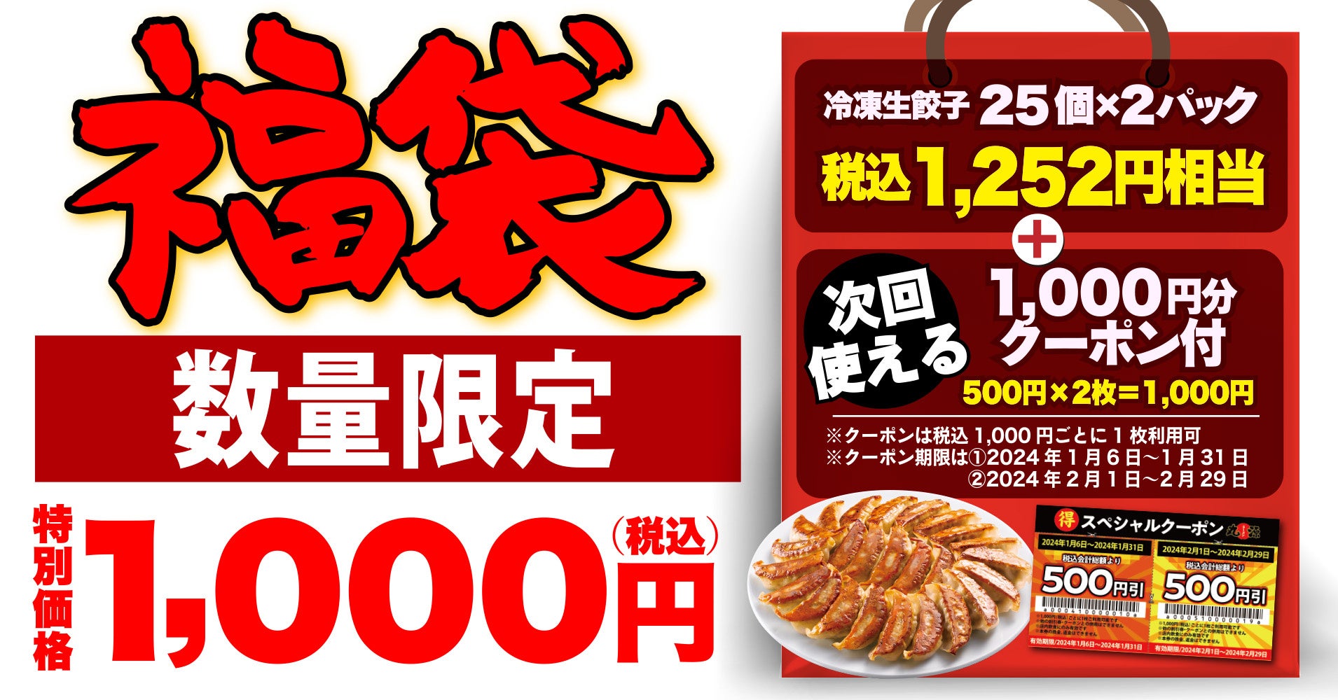 株式会社物語コーポレーション(本社:愛知県豊橋市/代表取締役社長:加藤 央之)が全国201店舗展開中の『丸源ラーメン』は、2023年12月28日(木)〜2024年1月5日(金)の期間限定で、冷凍生餃子50個とお得な限定クーポン2枚がセットになった「丸源餃子福袋」を1,000円(税込)で販売いたします。
