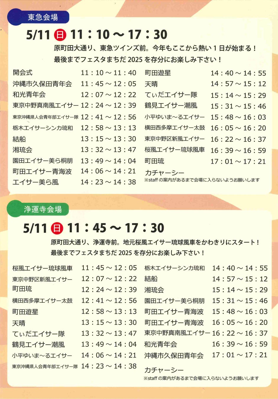 翌11日には、原町田大通り東急会場および浄運寺会場で、各エイサー団体による演舞が行われます。また、2025年9月公開予定の映画「宝島」のPRブースや沖縄物産展、地域の団体、プロスポーツチーム、企業などのブースが設置されるほか、模擬店の出店もあり、来場者は飲食等を楽しむこともできます。