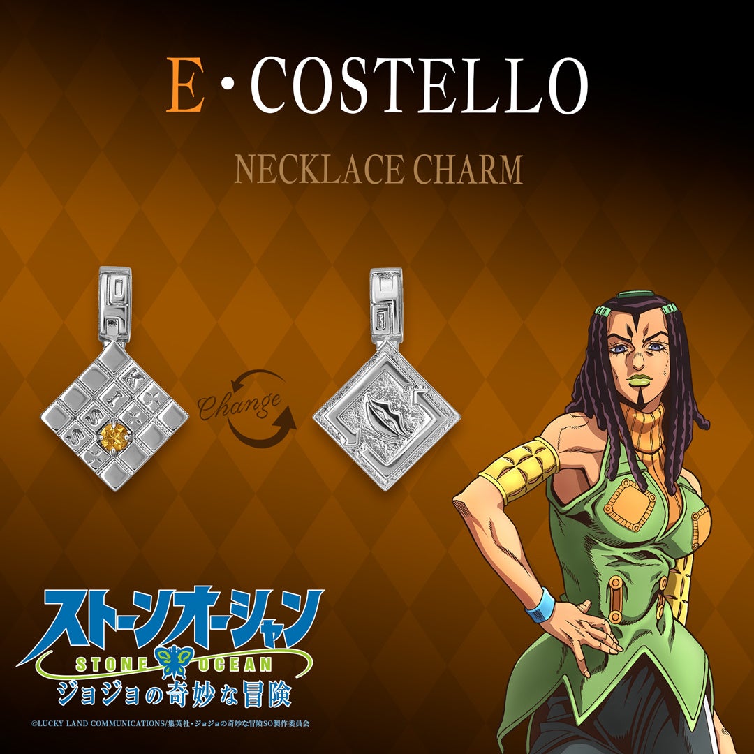 アニメ『ジョジョの奇妙な冒険 ストーンオーシャン』のキャラクターとスタンドを表現したネックレスチャーム。共通デザインとして、空条徐倫のベルトのバックルをバチカンにデザインしました。各キャラクターをイメージした天然石をセッティングし、表と裏で異なる表情を楽しめるリバーシブル仕様にもなっています。それぞれサイズや形を変えたバリエーション豊かなラインナップなので、お好きな組み合わせで自由にコーディネートが可能です。別売りの『JOJO★』刻印入りチェーンネックレスと合わせると、より一層『ジョジョの奇妙な冒険』の世界を肌で感じて頂けます。