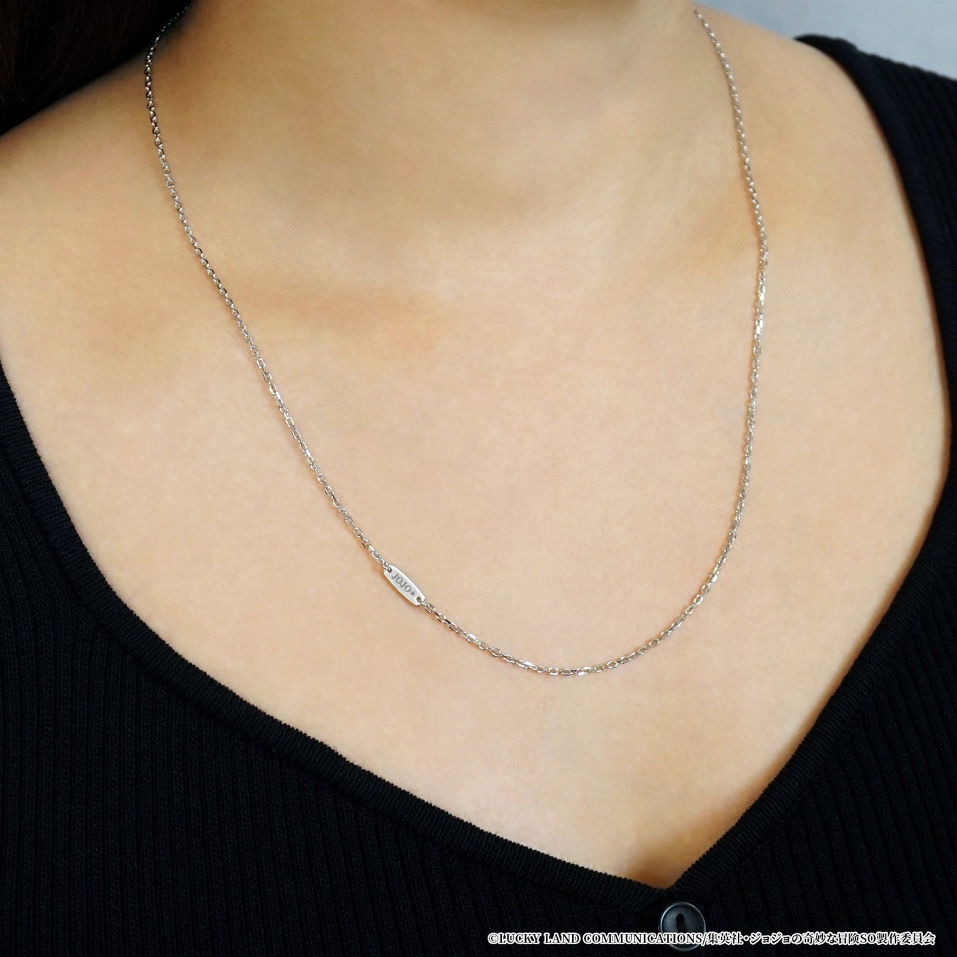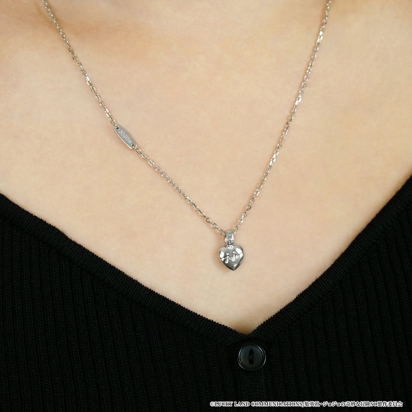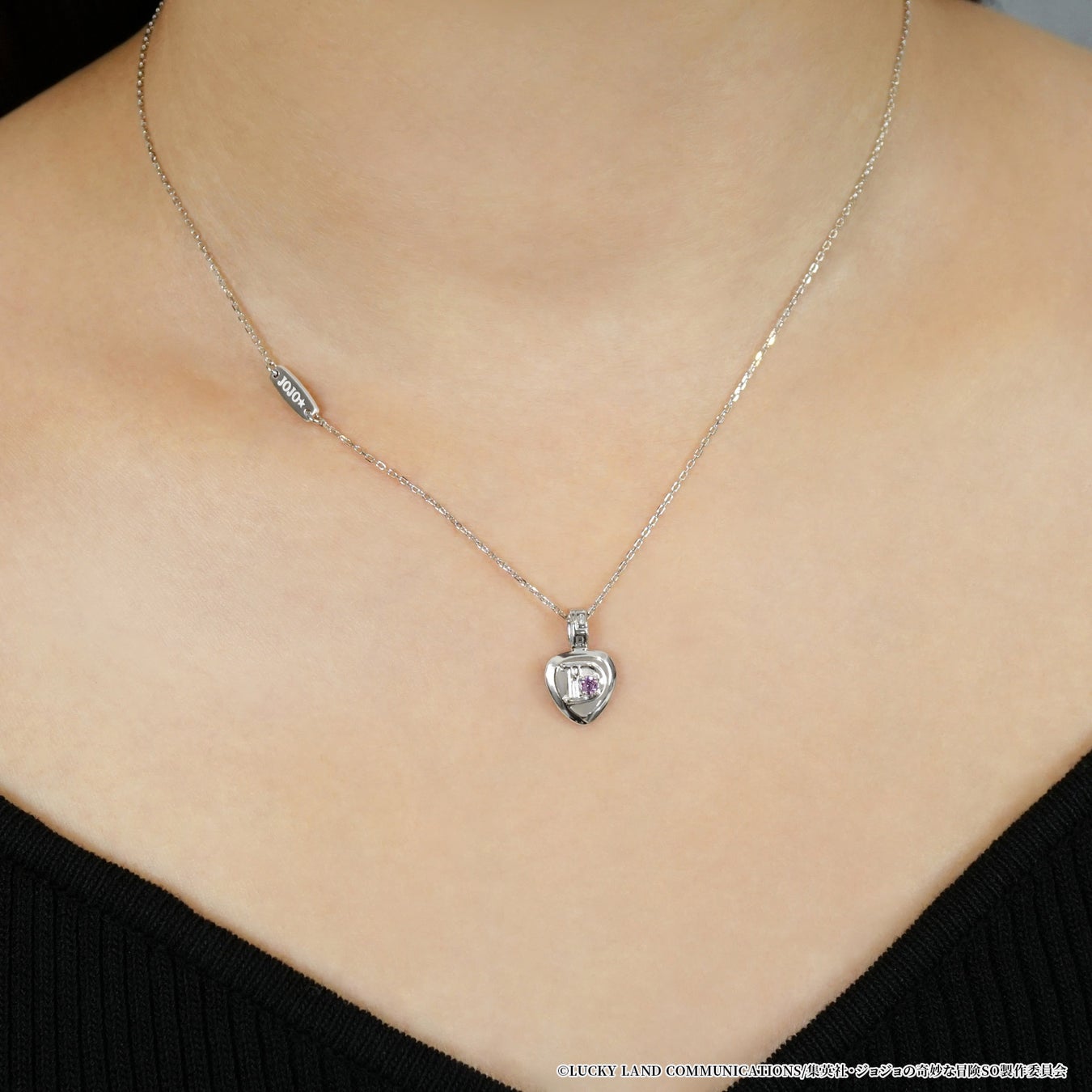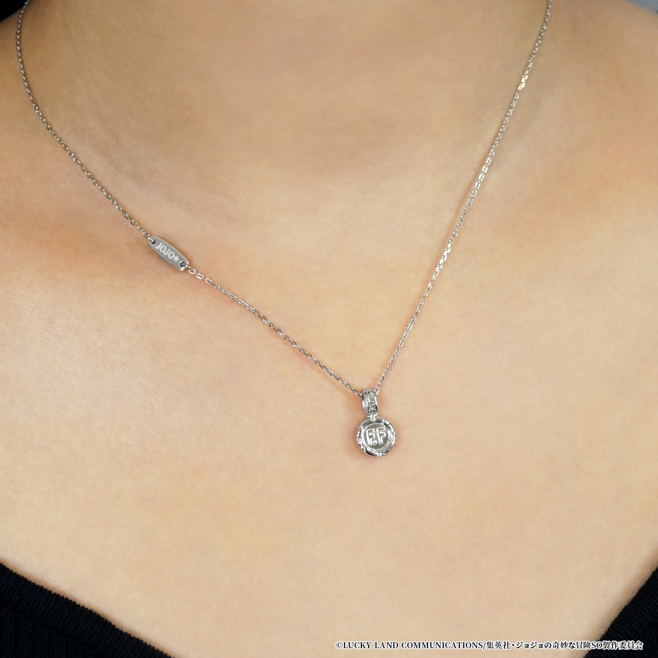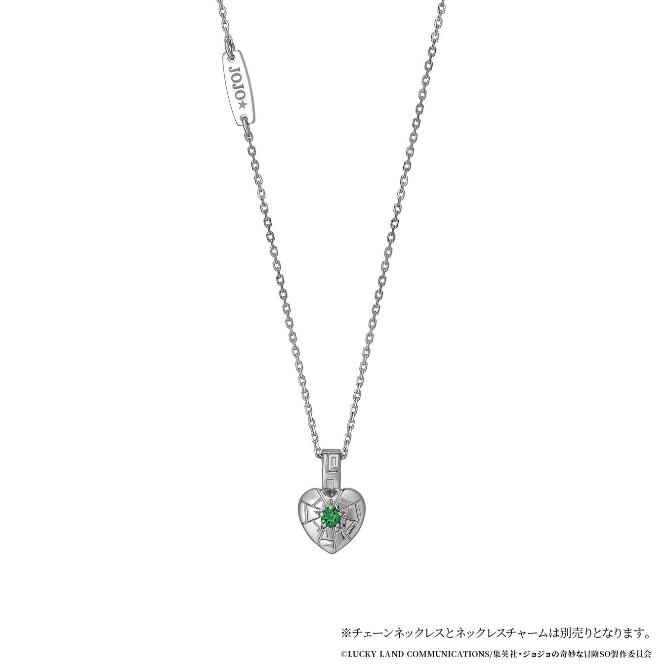 中央には空条徐倫の瞳のカラーをイメージした鮮やかなグリーンクォーツをセッティング。胸元のハートデザインに星の痣やスタンドの糸を取り入れデザインしました。裏側は愛称の『JOJO』を糸で描いたイメージで仕上げています。※着用のチェーンネックレスは別売りのものとなります
