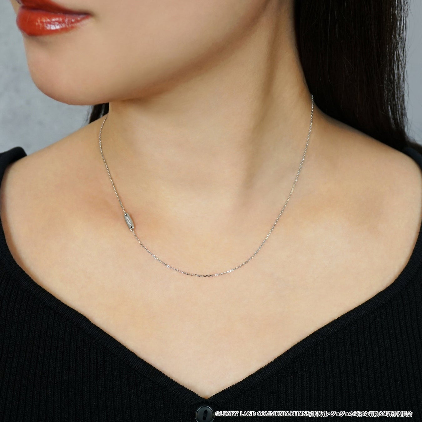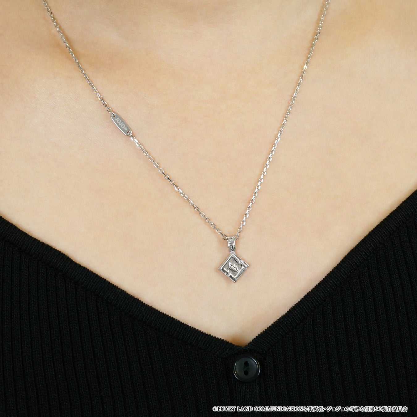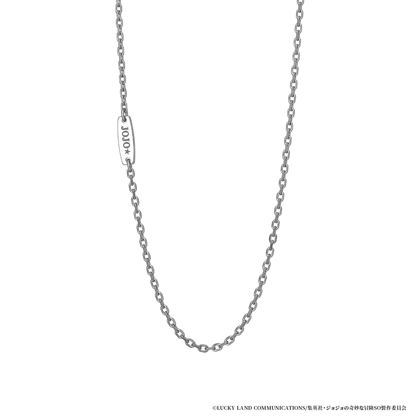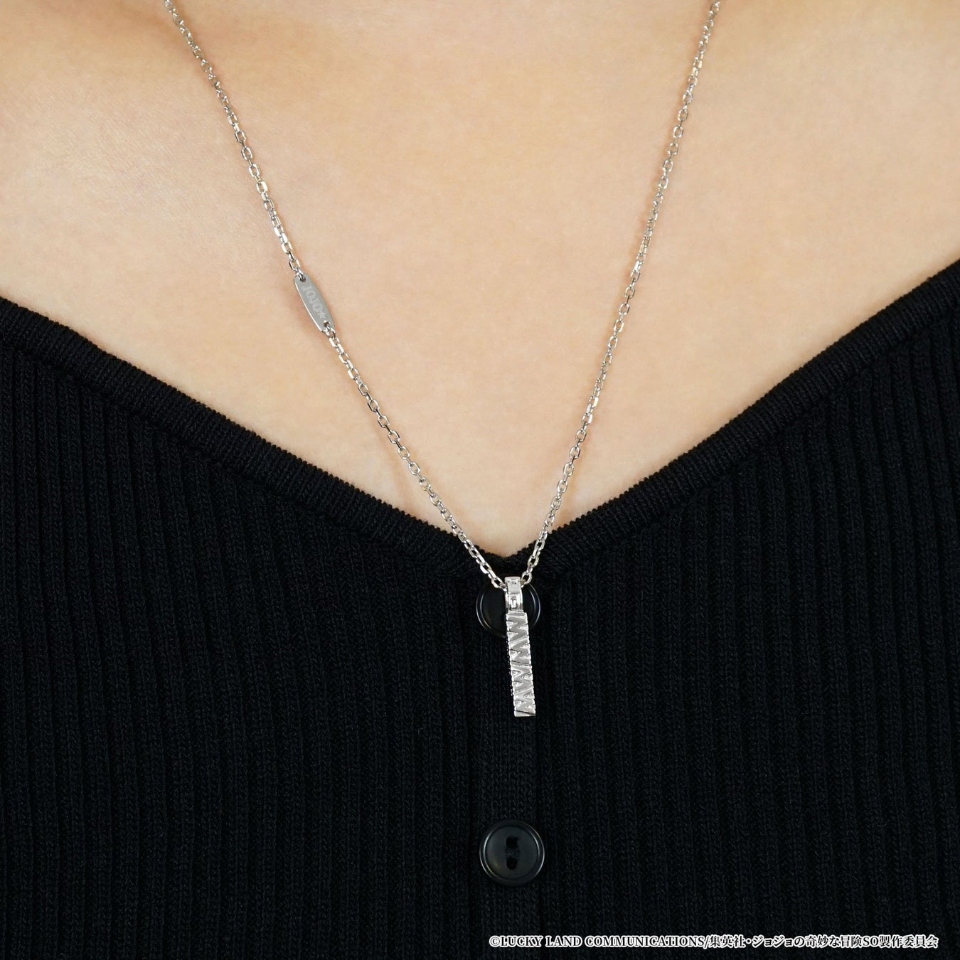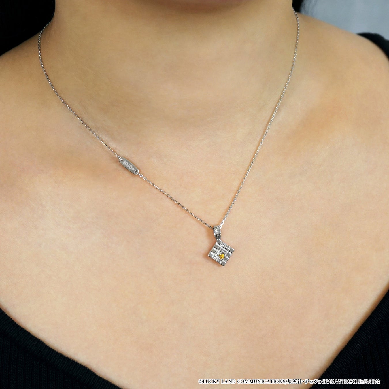 中央には空条徐倫の瞳のカラーをイメージした鮮やかなグリーンクォーツをセッティング。胸元のハートデザインに星の痣やスタンドの糸を取り入れデザインしました。裏側は愛称の『JOJO』を糸で描いたイメージで仕上げています。※着用のチェーンネックレスは別売りのものとなります