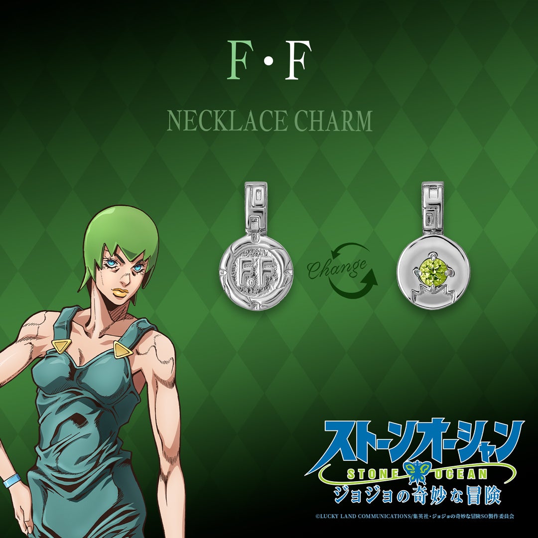 愛称の『F・F』をグラフィカルに表現し、スタンドの肩パーツと腕や足の模様を全体に取り入れています。裏側の中央にはF・Fの髪色をイメージしたペリドットをセッティング。特徴的な髪形をデザインしました。※着用のチェーンネックレスは別売りのものとなります