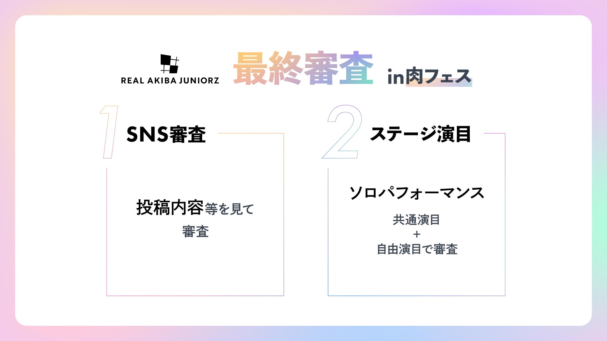 アニソン×ダンスエンターテインメントYouTuber「REAL AKIBA BOYZ」がプロデュースするジュニアユニット『REAL AKIBA JUNIORZ』第2期メンバーの最終審査が2025 年 5 月 5 日(月・祝)に開催される「肉フェス 2025 TOKYO ステーキ王決定戦」特設ステージにて実施されることが決定いたしました。