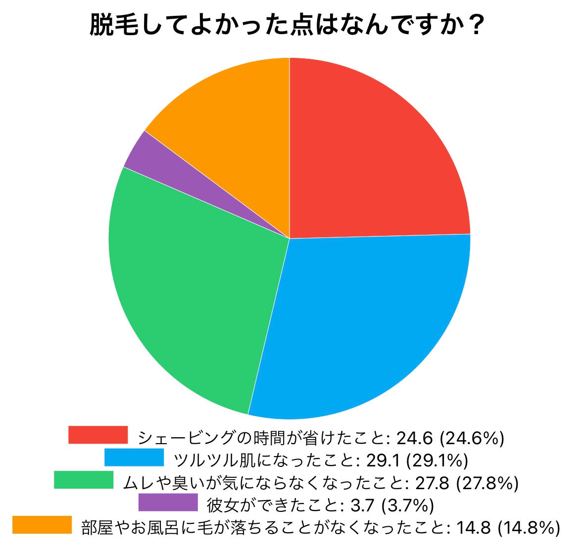 メリットの点では、”全身脱毛を始めてからシェービングの時間が省ける”というメリットだけでなく”異性からの印象も良くなる”と言った回答が多いことがわかりました。