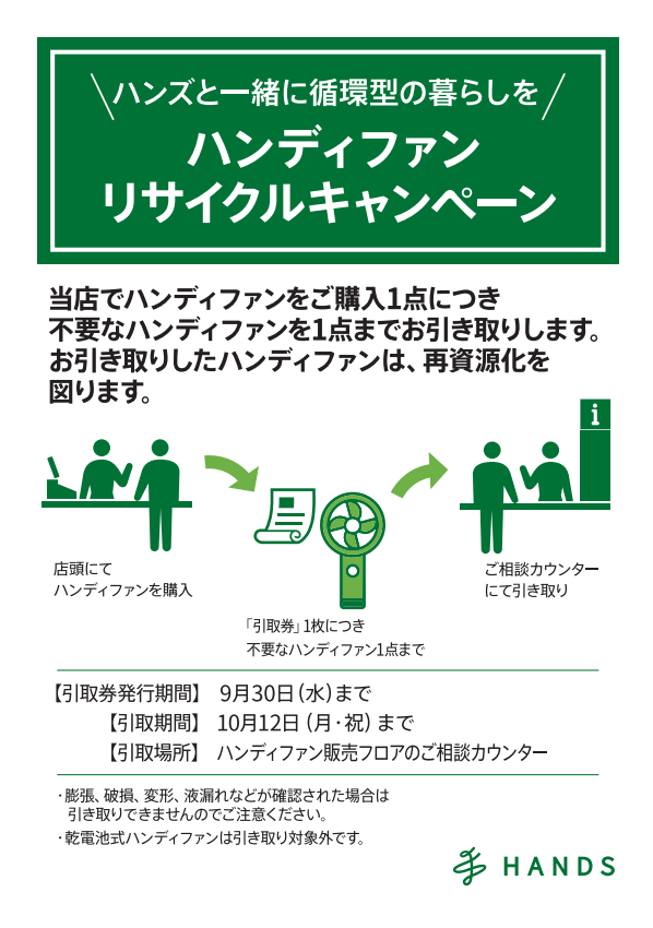 ハンズでは現在、ハンディファンのリサイクルキャンペーンを行っております。買い替えのしやすいチャンスに、店頭へ足をお運びください。