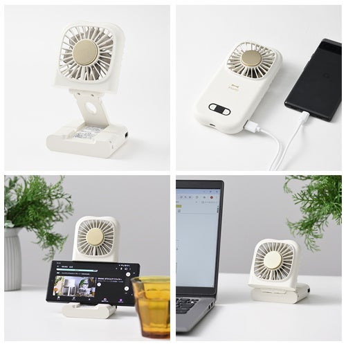 クリップ付きで衣服やカバンはもちろん、傘にも取り付けることができるアイテムです。シンプルなアイボリーグレーで目立ちにくく、ハンズフリーでしっかり涼めます。
