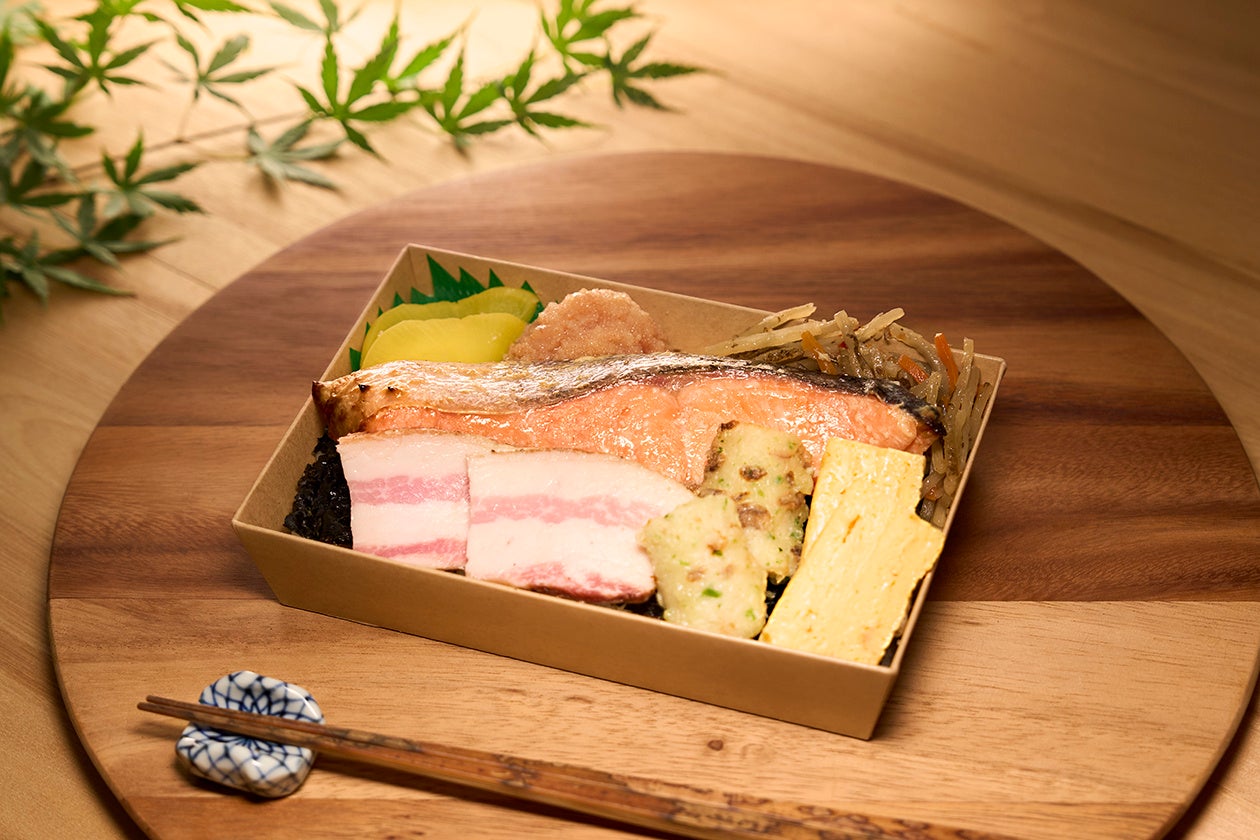 人気の西京漬け切り身の海苔弁当をサステナブルにアレンジ。日本酒の製造時に発生する酒粕を酒粕漬けとして漬け魚に活用し、また、循環型の体制づくりに取り組む「常陸野BARREL SMOKEハム工房」において製造時に発生する、ベーコンの切り落とし端材も弁当に取り入れました。