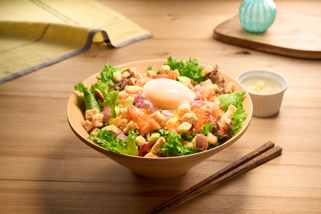 国産小麦を使用したパンをクルトンにして、刺身を切り分ける際に出てくる魚の端材と組み合わせました。刺身には、日替わりで新鮮な魚を使用しています。フレッシュな野菜、ごろごろ入った刺身、アクセントとなるクルトン、そこへまろやかなシーザードレッシングが加わることで、絶妙な味わいのコラボレーションを生むシーザーサラダです。