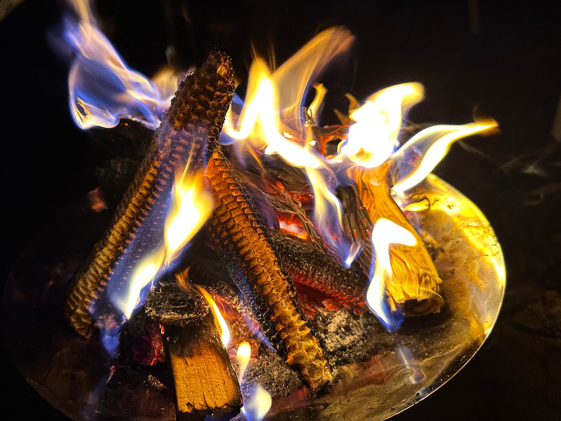 夜には、休暇村南阿蘇で「地トウキビde焚き火」を開催しています。乾燥した芯と葉を組み上げ、小さな焚き火を囲みながら焼きマシュマロを楽しめる体験です。