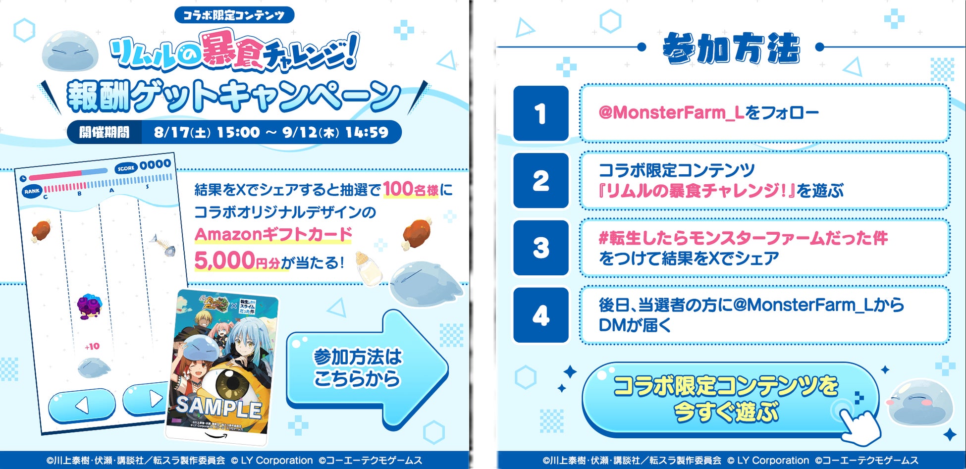 期間中、特設サイト内のミニゲーム「リムルの暴食チャレンジ!」をプレイして、結果を指定ハッシュタグ「#転生したらモンスターファームだった件」をつけてX(旧Twitter)でシェアすると、抽選で100名にコラボオリジナルデザインのAmazonギフトカード5,000円分が当たります。