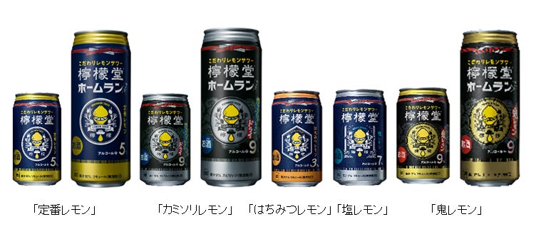 全5種のレモンサワー(「定番レモン」、「塩レモン」、「はちみつレモン」、「鬼レモン」、「カミソリレモン」)を350ml缶、そしてその中から、「定番レモン」、「カミソリレモン」、「鬼レモン」は、ゆったりとしたい時間に ぴったりの“ホームランサイズ”500ml缶でお届けしています。