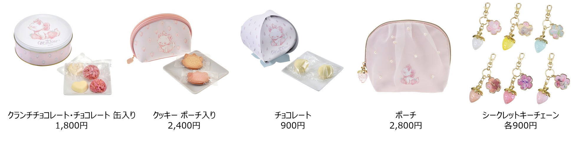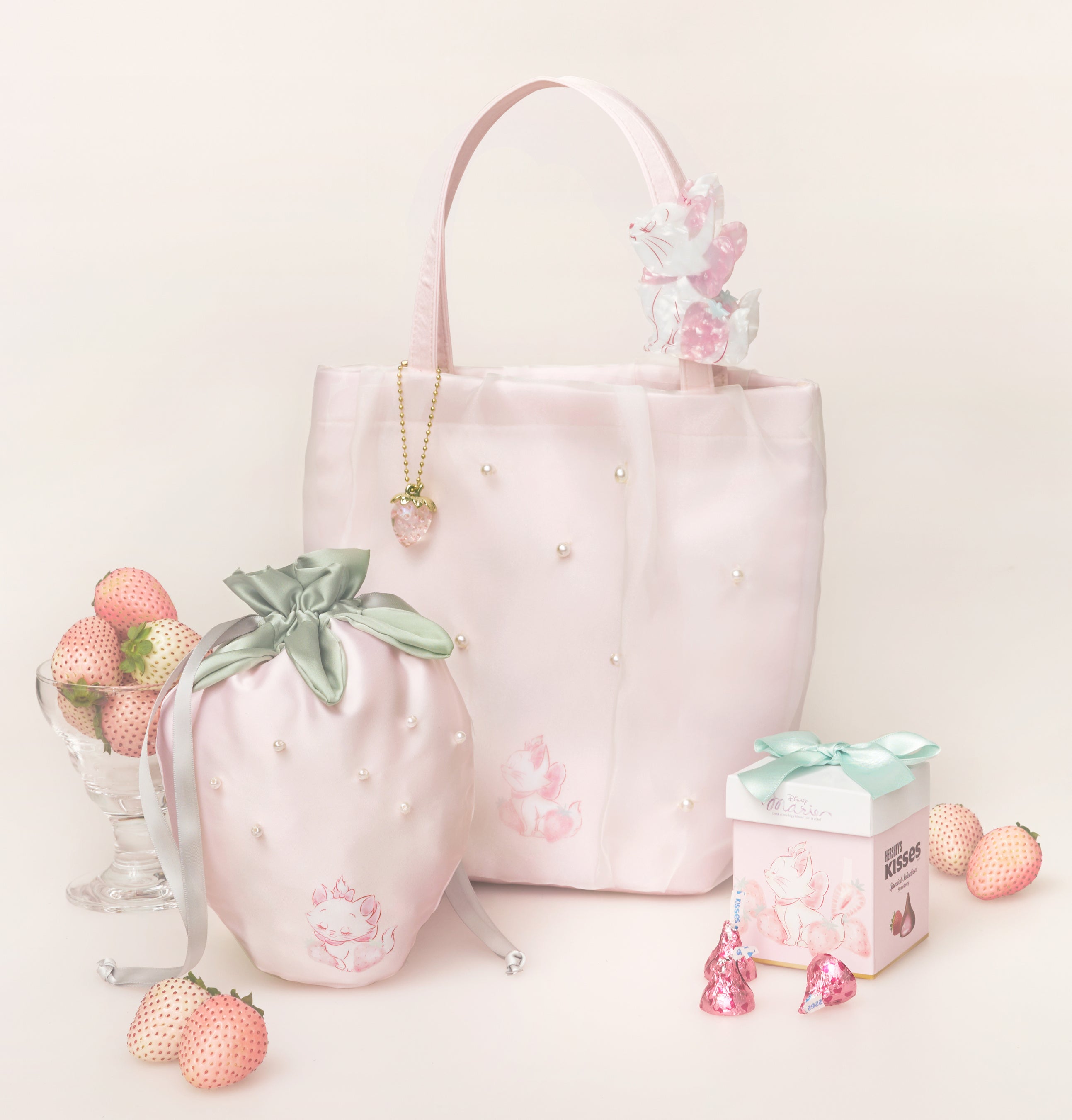 白いちごとマリーをデザインしたアイテムは、缶入りのチョコレートやクッキーとポーチのセット、「HERSHEY'S(ハーシー)」のキスチョコレートなど、いちごフレーバーのスイーツを多数展開。春に贈るギフトとしてもおすすめです。さらに、白いオーガンジーとパールビーズが華やかなトートバッグやポーチなどのファッション雑貨もご用意しました。そのほか、ディズニーキャラクターを描いたお花のチャームと、カラフルないちごのチャームを組み合わせた全6種のシークレットキーチェーンも登場します。