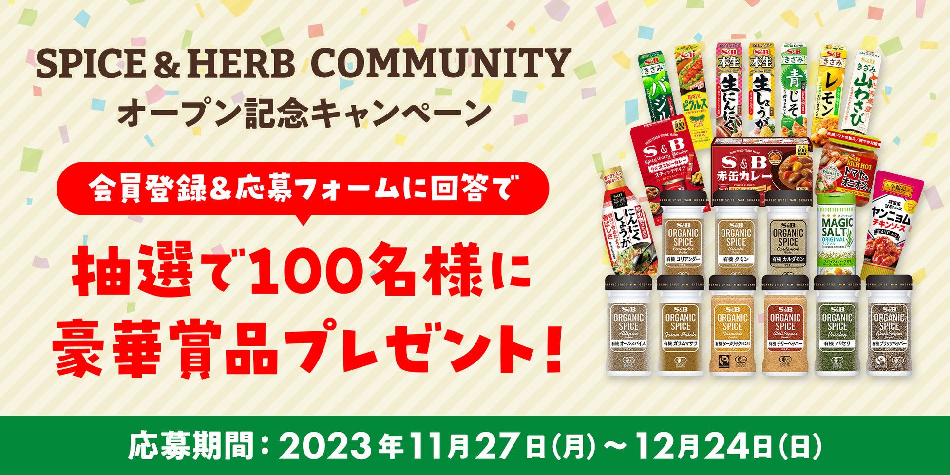 コミュニティサイトのオープンを記念して、抽選で合計100名様にエスビー食品の商品などが当たるキャンペーンを実施します。
