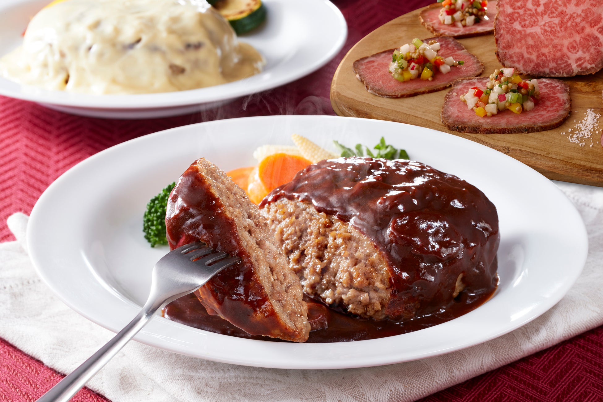 弊社ギフトセットの中で売上No.1セット※である「至福の洋食 田崎真也セレクション」のローストビーフ&ハンバーグセットを参考に、黒毛和牛ローストビーフ入りの高価格帯セットを新発売します。焙煎した黒胡椒を程よく使用した黒毛和牛のローストビーフと、「二重包餡」「鉄板焼き」「過熱蒸気オーブン仕上げ」の3つの手順を経て手間を惜しまず作った、こだわりのハンバーグを詰合せています。160gのハンバーグと100gのソースのボリューム感あふれる内容となっており、ソースは、「パルメザンチーズ、モッツアレラなど4種のチーズを使用したとろりとしたソース」と「赤ワインを加えた濃厚なコクが楽しめるデミグラスソース」の2種類をご用意しました。たっぷりソースをかけたボリューミーなハンバーグは食卓を彩ります。