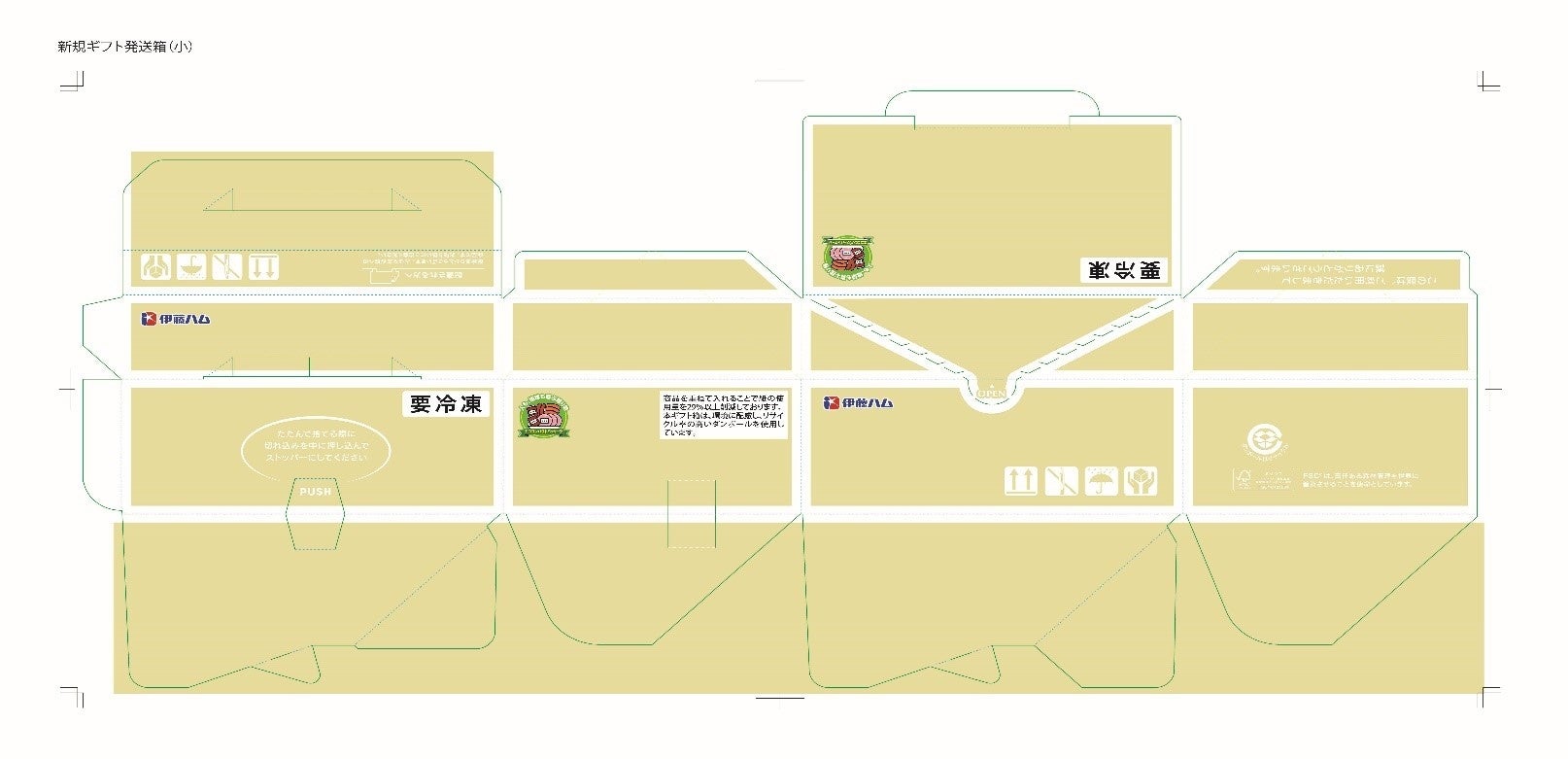 リサイクル率が高いダンボールを使用し、更に従来の化粧箱と比べ包装材料を減らすことで箱重量を29%以上削減しました。商品を箱に入れる際に、縦に重ねることでコンパクトに収めることができ、輸送時やお客様が冷凍庫で保管される際もスペースを取らずに済みます。化粧箱には環境に配慮したものであることが伝わるように、「人も、地球も喜ぶ贈り物エココンパクトパッケージ」いうロゴマークを作成し、印刷します。
