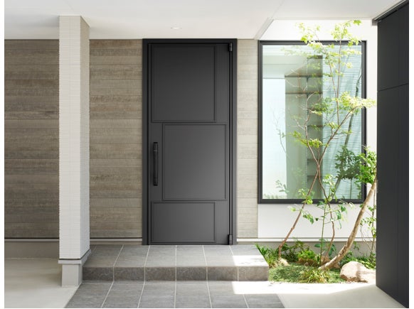 2022年度に断熱等性能等級5・6・7(※1、以下、断熱等級)が創設され、2025年度には断熱等級4が、2030年度には断熱等級5の義務化が予定されています。このように国を挙げた住宅の高断熱化への取り組みが急速に進む中、窓だけでなく玄関ドアの高断熱化も求められています。また近年の住宅トレンドとして、デザイン面ではモダンスタイルが継続して人気があり、シンプルな壁面と立体的な陰影でまとめた住宅デザインが多くみられます。カラーはブラック色をアクセントとしたコーディネイトがトレンドで、グレイ色基調の外壁と組み合わせたローコントラストのすっきりした色調が多く採用されるなど、シンプルでシックな洗練されたデザインが好まれる傾向にあります。