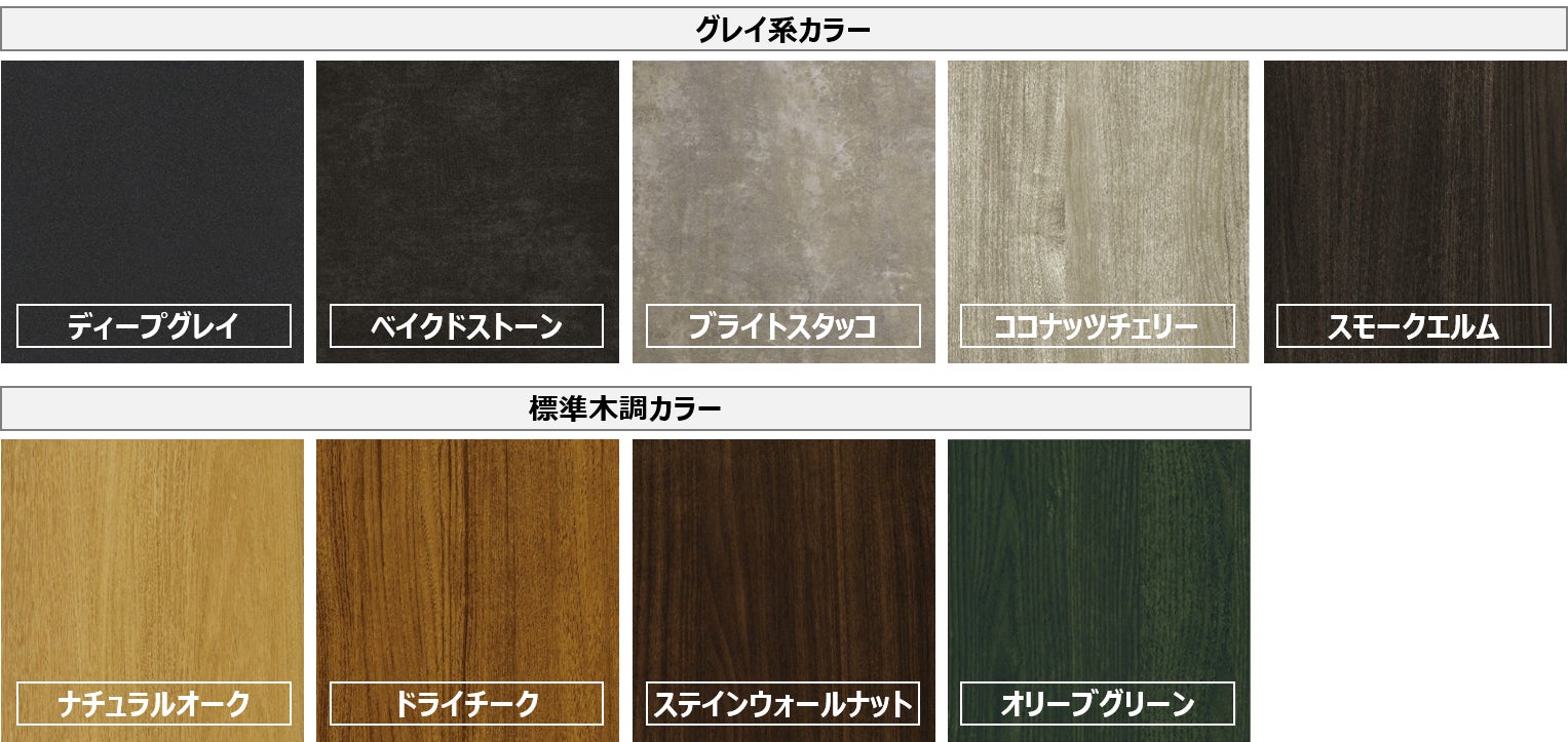 住宅トレンドであるローコントラストなグレイ系カラーを5色拡充し、モダン住宅の外観コーディネイトの幅を広げます。また、ベーシックなライト・ミディアム・ダークの木調色も現在の住宅に調和しやすいよう、彩度を抑えた色調へ変更し、より建物に馴染む風合いへ刷新します。