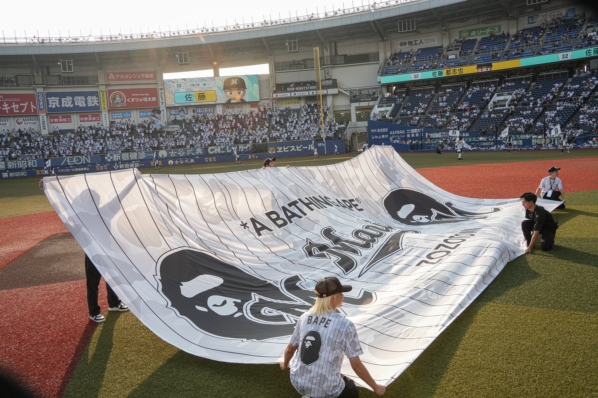 試合では、千葉ロッテマリーンズの選手がBAPE®︎との特別コラボユニフォームを着用して出場。BAPE®︎のアイコニックなデザインが球場を彩り、熱戦が繰り広げられる中、会場はファンの熱気に包まれました。