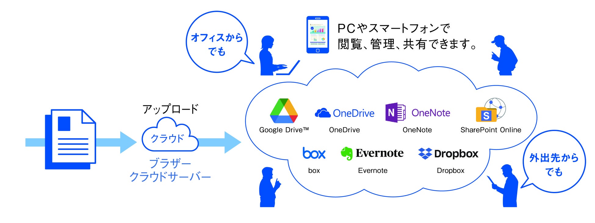 スキャナー本体の液晶操作のみで、スキャンデータをEvernoteやDropboxのようなクラウドを活用した各種ウェブサービスへ直接アップロードが可能だ【※4】。さらにブラザークラウドサーバー経由で指定したEメールアドレスに直接送ることもできる。