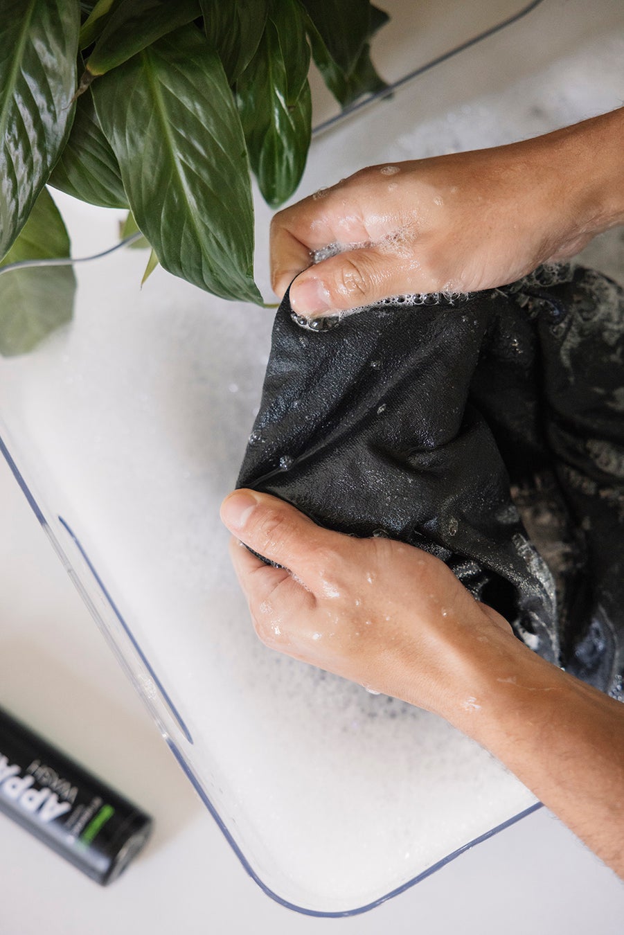 25mlのAPPAREL WASHを使用し、衣類は裏返しネットに入れ冷水かつクリーニングコースなどの優しく洗うコースで洗ってください。