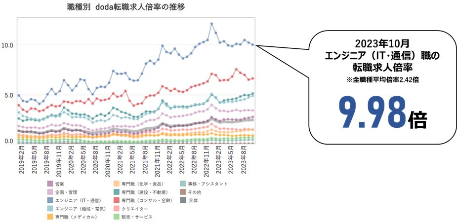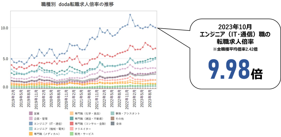 デジタル社会の発展が進み、企業や事業の成長にIT人材の確保が必要不可欠な時代となっています。事業会社でもIT人材の採用ニーズが高まり、ITエンジニアの転職求人倍率は約10倍と採用競争が激しい状況が続いています。