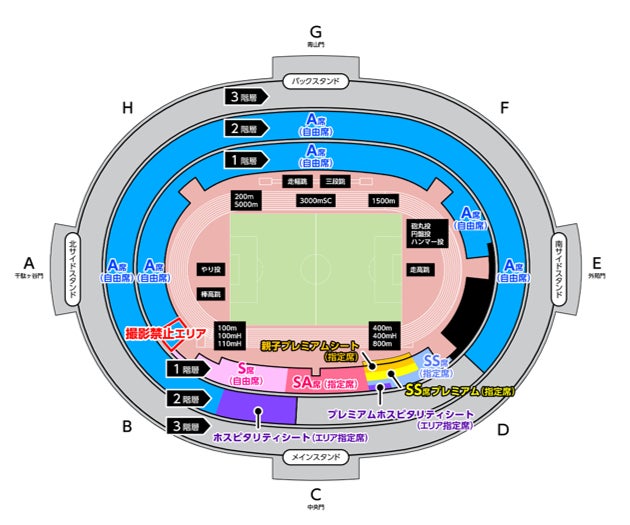 ※プレミアムホスピタリティ、ホスピタリティ、親子プレミアムシート、SS席(プレミアム含)、SA席、S席の購入でA席での観戦が可能です。
