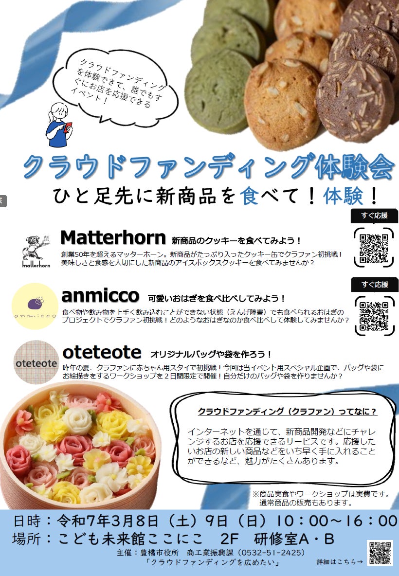 愛知県豊橋市は2025年3月8日(土)、9日(日)の2日間、 こども未来館ここにこ(松葉町)で、クラウドファンディング(CF)体験会を行います。現在、CF挑戦中の新商品の一部が購入できるだけでなく、実際にCFでプロジェクトを支援する流れも学べます!
