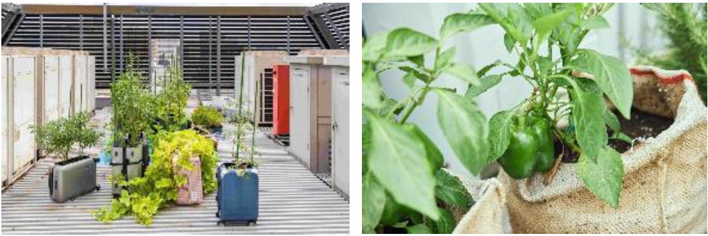 庭のホテル 東京では、2022年秋にホテル敷地内の4つの庭から集めた落ち葉を腐葉土に加工し、2023年春より屋上の約35㎡のスペースで野菜とハーブの栽培を開始しました。これらの収穫物はすべて館内の和洋2つの直営レストランで使用しております。また、宿泊ゲストが廃棄したスーツケースを加工し、プランターとして再利用するというホテルならではの取り組みが、ユニークだと多くのメディアに取り上げていただいております。