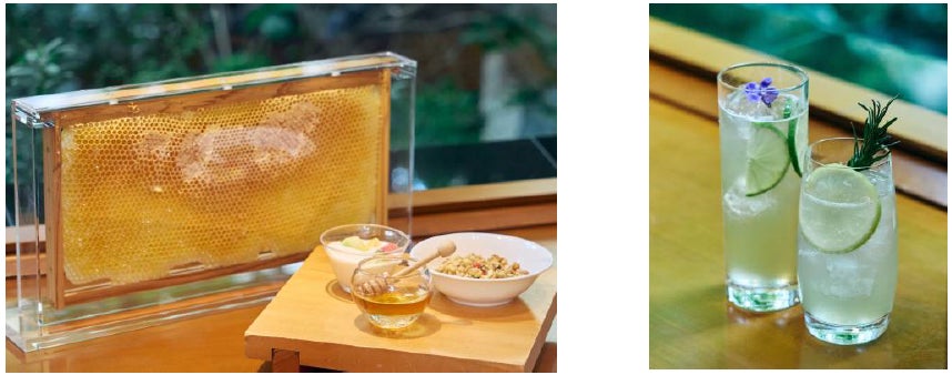 ① 朝食ブッフェ (ヨーグルトなどに添える形での提供) ② オリジナルドリンク ・「ハニーレモンスカッシュ」 甘酸っぱさが絶妙でローズマリーの香りが爽やかに広がるソフトドリンク ・「ハニーブランデーフィズ」 林檎のブランデーと蜂蜜が織りなす、爽やかで軽い飲み口のカクテル |