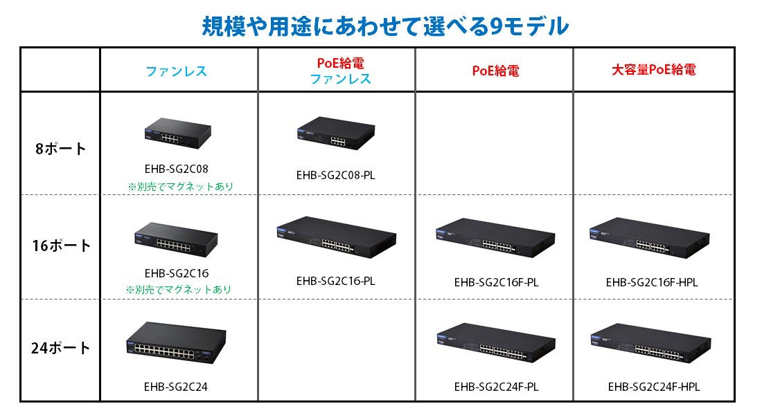 一部のモデルを除き、ネットワーク端末に電源を供給できるPoE給電に対応しています。さらに“EHB-SG2C16F-HPL/EHB-SG2C24F-HPL”は、より多くの端末を接続できる大容量PoE給電対応モデルとなっています。
