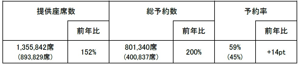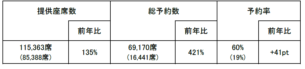 国内線の総予約数は、前年比で200%となっており、大変好調に推移しております。方面別では、全方面で前年を大きく上回っていますが、特に、東北・北陸、関西、中国・四国、九州方面が好調に推移しています。日別では、下りが4月29日をピークに5月1日まで、上りは5月3日と5日で、予約率の高い日が続いています。